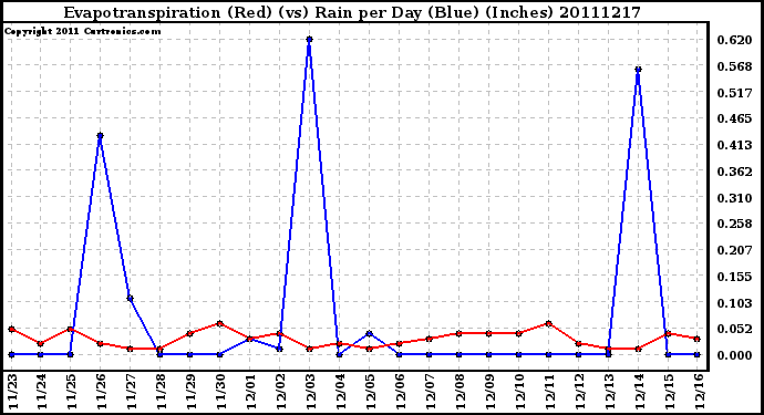 20111217 Evapotranspiration (Red) (vs) Rain per Day (Blue) (Inches)