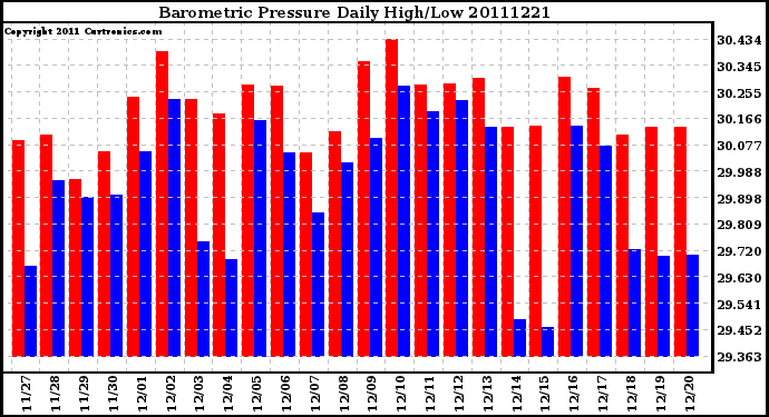Milwaukee Weather -- 20111221 Barometric Pressure Daily High/Low -- From curtronics.com by Curt Blank