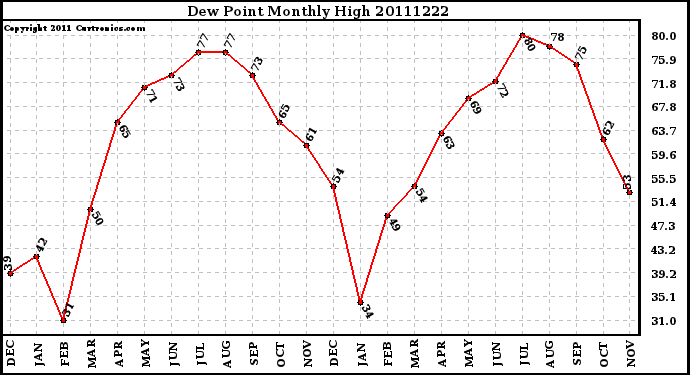Milwaukee Weather -- 20111222 Dew Point Monthly High -- From curtronics.com by Curt Blank