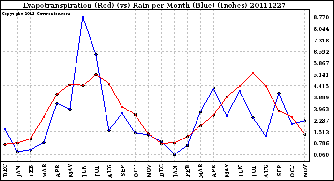 20111227 Evapotranspiration (Red) (vs) Rain per Month (Blue) (Inches)